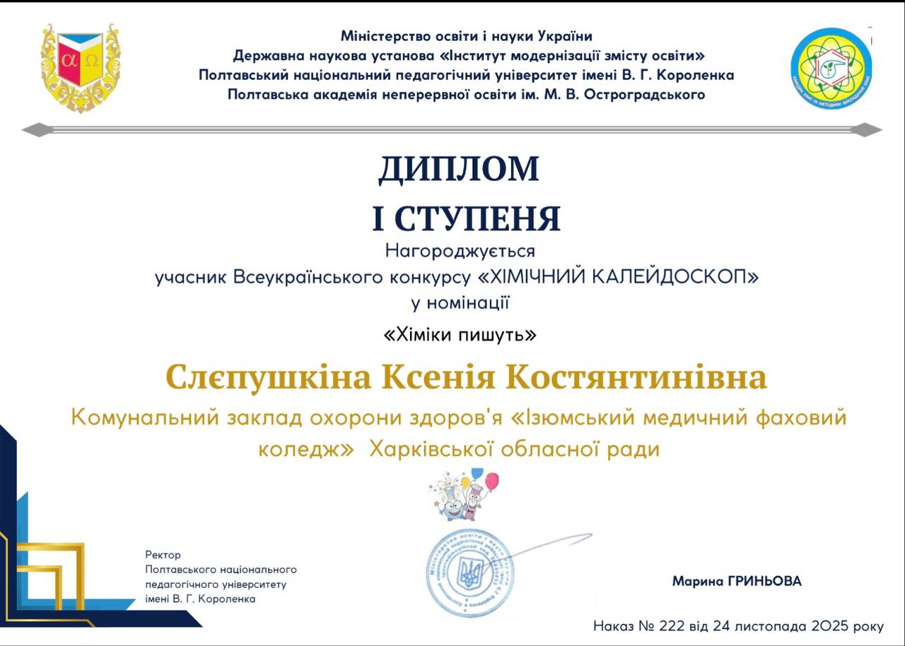 Вітаємо студентку ІІ курсу групи М-21 Ксенію Слєпушкіну — переможницю Всеукраїнського конкурсу «Хімічний калейдоскоп» у номінації «Хіміки пишуть», де вона здобула І місце з роботою «Коли хімія пахне кавою» та її наукового керівника Пономаренко Єлизавету Миколаївну, яка підготувала нашу переможницю!!! 👏👏👏